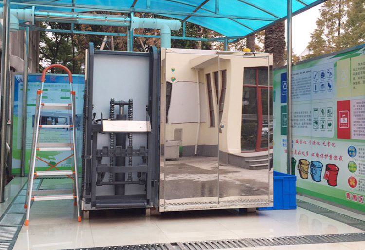 就地式处理是指在有机垃圾的产生点,进行就地处理,日处理需求一般在10吨以内,如学校、小区、酒店、单位食堂等场所,是比较集中产生餐厨垃圾的地方,然后可以在相关场所的旁边设立一个小型的餐厨垃圾处理站,同时配套餐厨垃圾处理设备,相关场所所产生的餐厨垃圾,可用收集桶随时拉到处理站点,然后由工作人员倒入餐厨垃圾处理设备来进行发酵处理,最后可转化为有机肥原料,从而实现有机垃圾的资源化利用。其中配套的餐厨垃圾处理设备,是餐厨垃圾处理一体化设备,集提升、称重、倒料、破碎、冲洗、脱水、发酵和自动出料功能于一体,核心工艺为微生物高温好氧堆肥技术,来料的餐厨垃圾都可以由这一台设备来完成,另外餐厨垃圾处理站内,还可以配备有油水分离器、废水处理系统、废气处理系统。